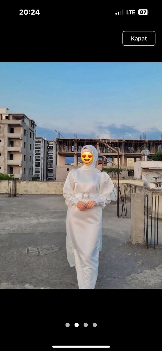 Yüksek yakalı, uzun kollu, şeffaf detaylı ince uzun beyaz elbise, ipeksi kumaştan, sade ve mütevazı tarz için uygundur.