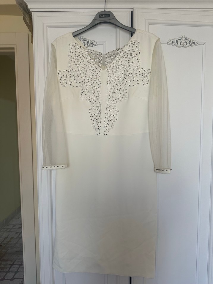 Uzun beyaz abiye elbise, V yaka ve uzun kollu olup, zarif inciler ve işlemelerle süslenmiştir. Düğünler için modern klasik tarzda, rahat kesimdir.fotoğrafta da belirtildiği gibi bir kolundaki boncukların 2-3 tanesi dökülmüştür . Onun dışında hiç bir sıkıntısı yok 1 kere nikahta giyildi.