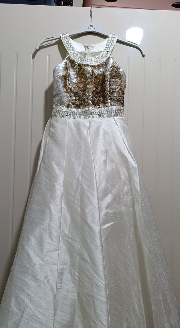Uzun beyaz abiye elbise, dar kesim, kolsuz ve askısız yakalı. Parlak işlemeli detaylara ve drapeli stile sahiptir, düğün için uygundur.