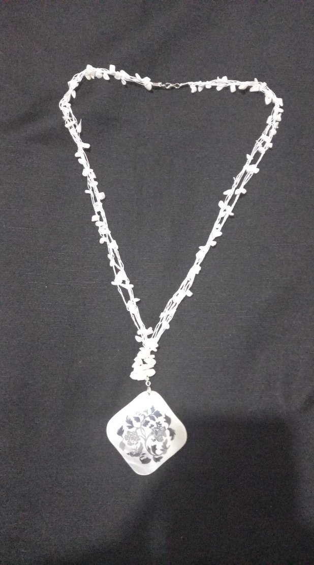 Uzun beyaz işlemeli kolye, detaylı zincir yapısı ve bohem tarzıyla düğünler için uygundur.sedef Gri tonlar retro bir dokunuş katar.