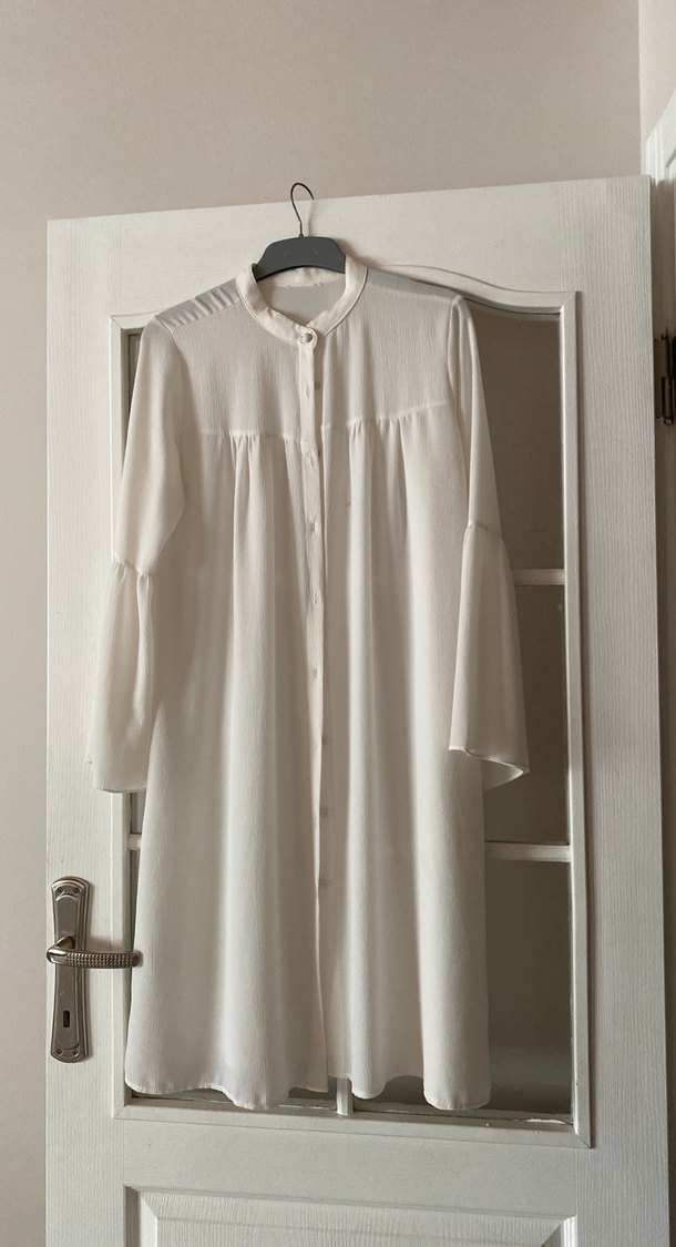 Uzun beyaz kadın bornoz, bol kesim ve uzun kollu, minimalizm ve bohem tarzını yansıtan, düğmeli ön kısmı olan desensiz bir tasarıma sahiptir. Boy 104 iki kol arası 55