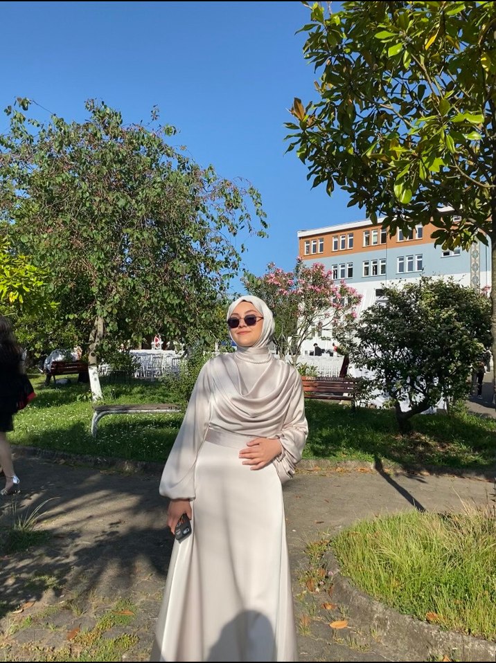 Yüksek yakalı, uzun kollu, bol kesim beyaz elbise. İpek gibi kumaştan drapeli, minimalist sokak stili için uygundur. arkasında hafif bir kuyruğu vardır beli kemeridir iç belli etmez satendir