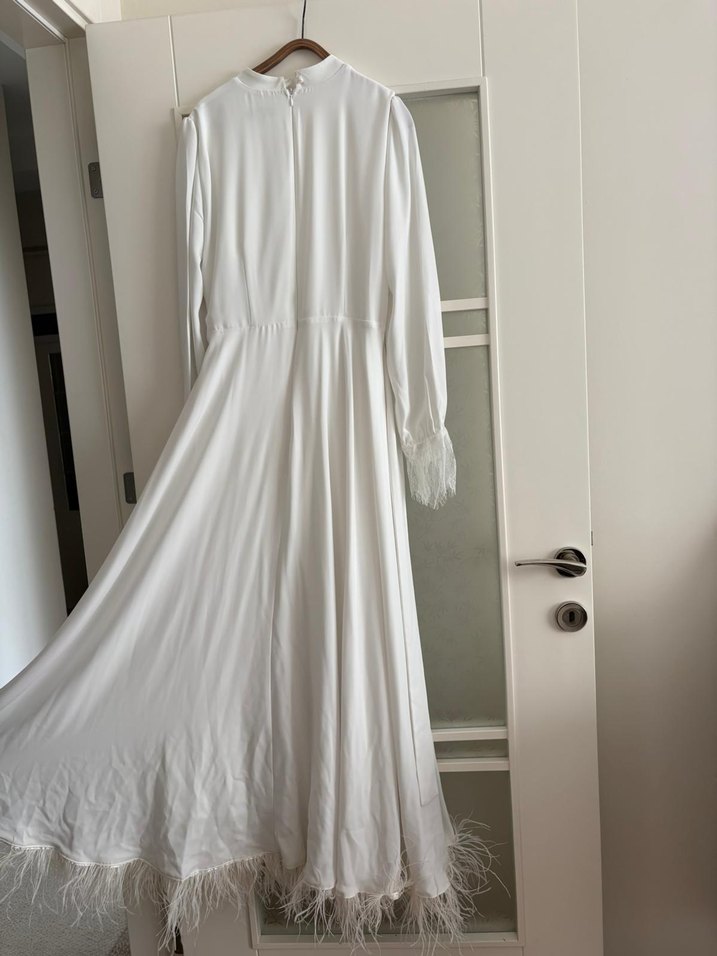 Uzun beyaz elbise, dökümlü ve salaş kesimlidir. İpek gibi kumaştan yapılmış, V yaka ve manşet ile etek ucunda tüy detayları vardır.