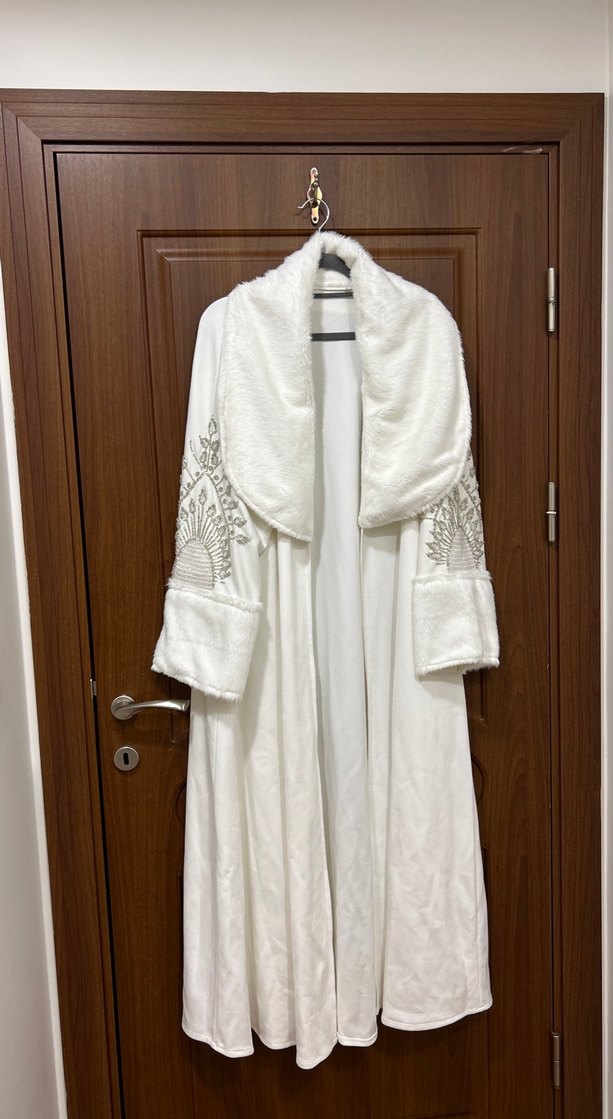 Dubai ürünü Uzun beyaz kadın süet kaban , bol kesim, uzun kollu ve parlak nakış detaylarına sahiptir. Yumuşak şal yaka ve manşetlerle konfor sağlar. Oversize s/m/l beden uyumludur