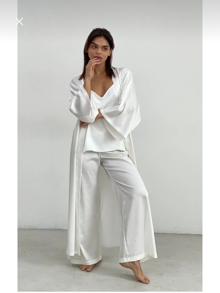 Hiç kullanılmadı ama etiketini koparmıştım. Askılı üst pijama altı ve uzun sabahlık olmak üzere 3 parçadan oluşuyor.