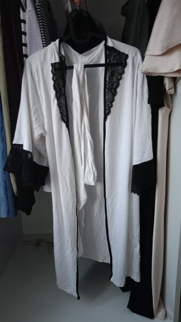 Uzun Beyaz Kadın Sabahlık Siyah Dantel Detaylı