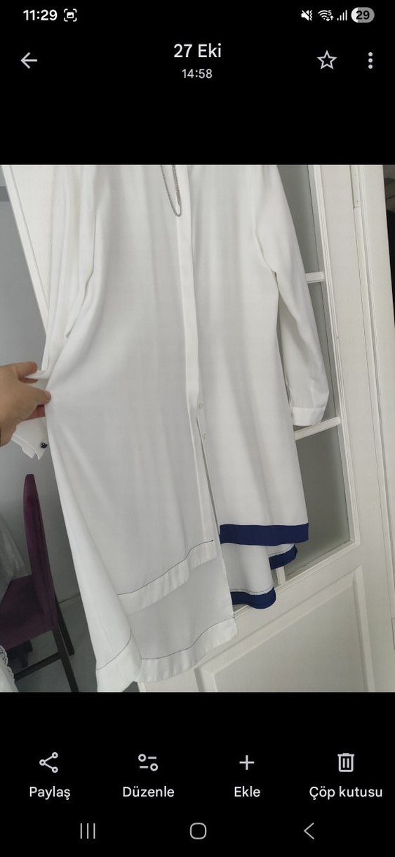 Uzun beyaz kadın elbise, salaş kesim ve uzun kollu. Minimalist, sokak stili ve desensiz, etek ucunda koyu detaylar bulunur.