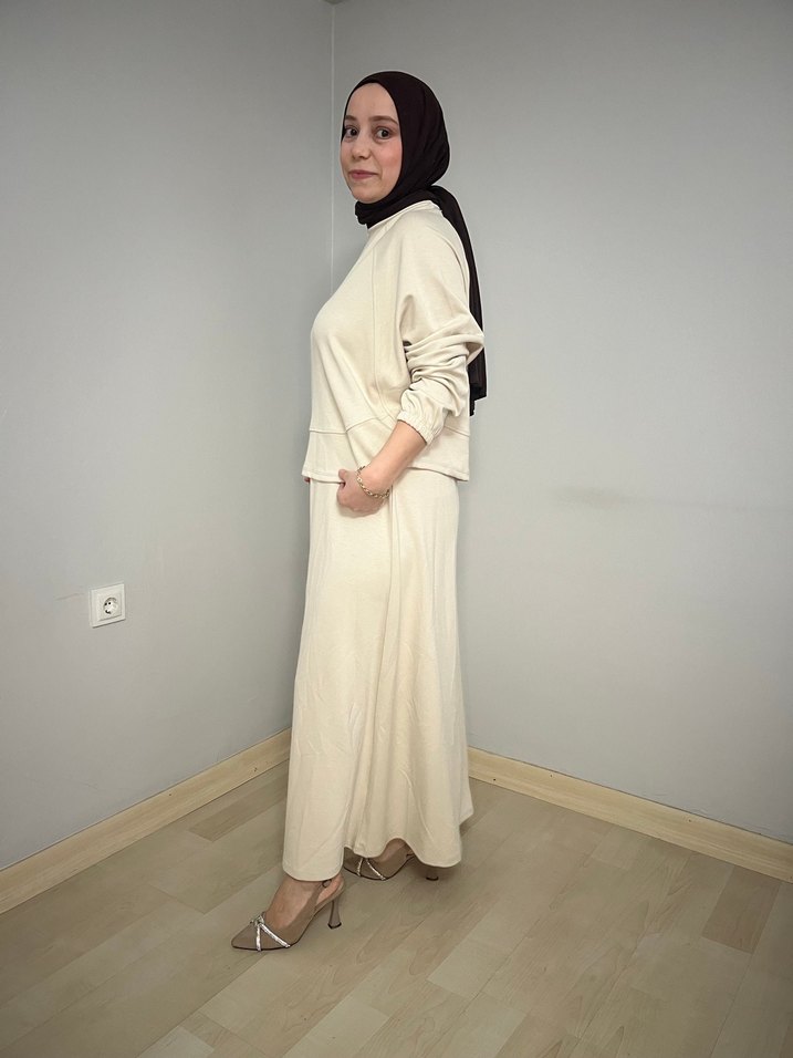 Uzun, uzun kollu, yüksek yakalı krem renk kadın takımı. Hafif sentetik kumaştan, desensiz, minimalist ve günlük kullanıma uygun. Rahat ve şık görünümlü.oysho kumaştır 1/2 beden olarak mevcuttur