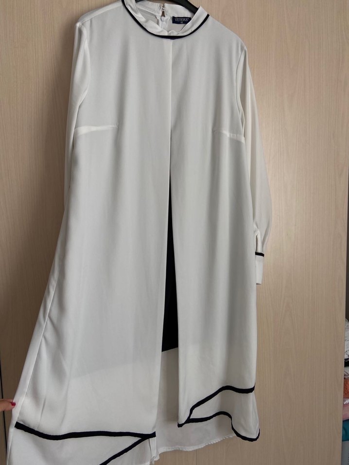 Uzun beyaz tunik, yüksek yakalı ve uzun kollu, dökümlü tasarıma sahip. Siyah kenar detayları ve rahat kesimi ile günlük kullanıma uygun.