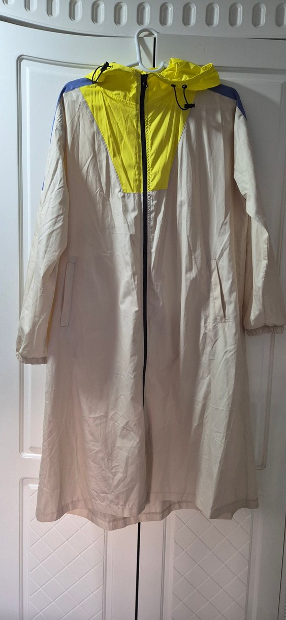 Uzun, bol kesim kadın yağmurluğu yüksek yakalı ve uzun kollu, açık renkte drapeli tasarıma sahip, günlük sokak tarzı için uygun. ☔