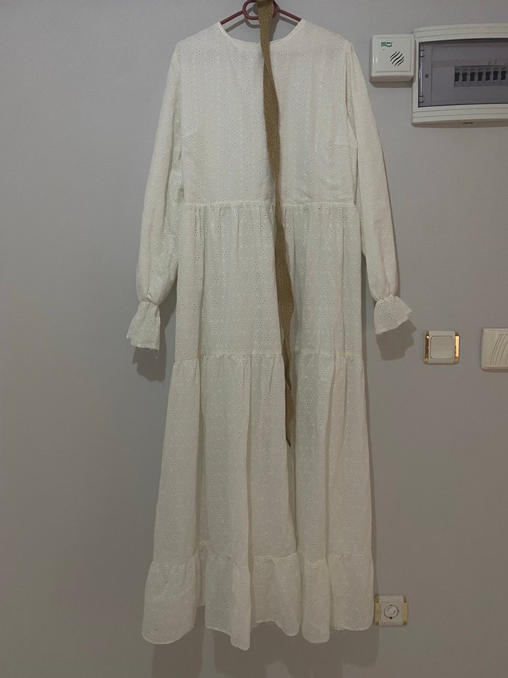 Uzun, beyaz keten kumaştan yapılmış, yüksek yakalı ve bol kesim bohem elbisedir. Fırfır detaylı ve uzun kolludur, günlük kullanıma uygundur. Özel dikimdir hiç kullanılmadı