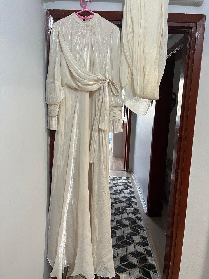 Uzun beyaz keten elbise, drapeli tasarımı, yüksek yakası ve uzun kolları ile bohem tarzda, rahat kesim ve düğünler için uygun.
