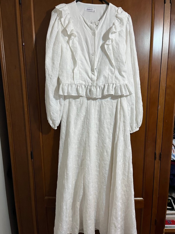Uzun beyaz keten kumaştan, bol kesim ve fırfır detaylı. Uzun kollu, yakası notched lapel tarzında, Parisli bohem şıklığını yansıtıyor. Desensiz ve açık renklidir, günlük kullanım için uygundur. Çok güsel etekli takım çok az kullandım Çok fazla bu tarz kıyafetim olduğu için satıyorum