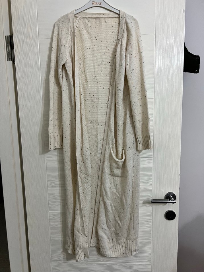 Uzun beyaz keten örgü kumaştan, bol kesim ve uzun kollu hırka. Bohem tarzda, yakalı ve cep detaylı, günlük kullanıma uygun.