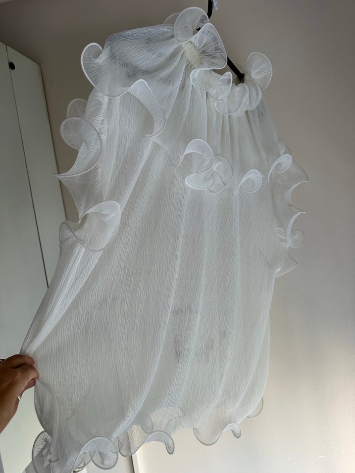 Keten kumaştan, volan detaylı, straplez ve kolsuz beyaz uzun bluz. Salaş kesimi ve bohem tarzıyla düğünler için uygun.