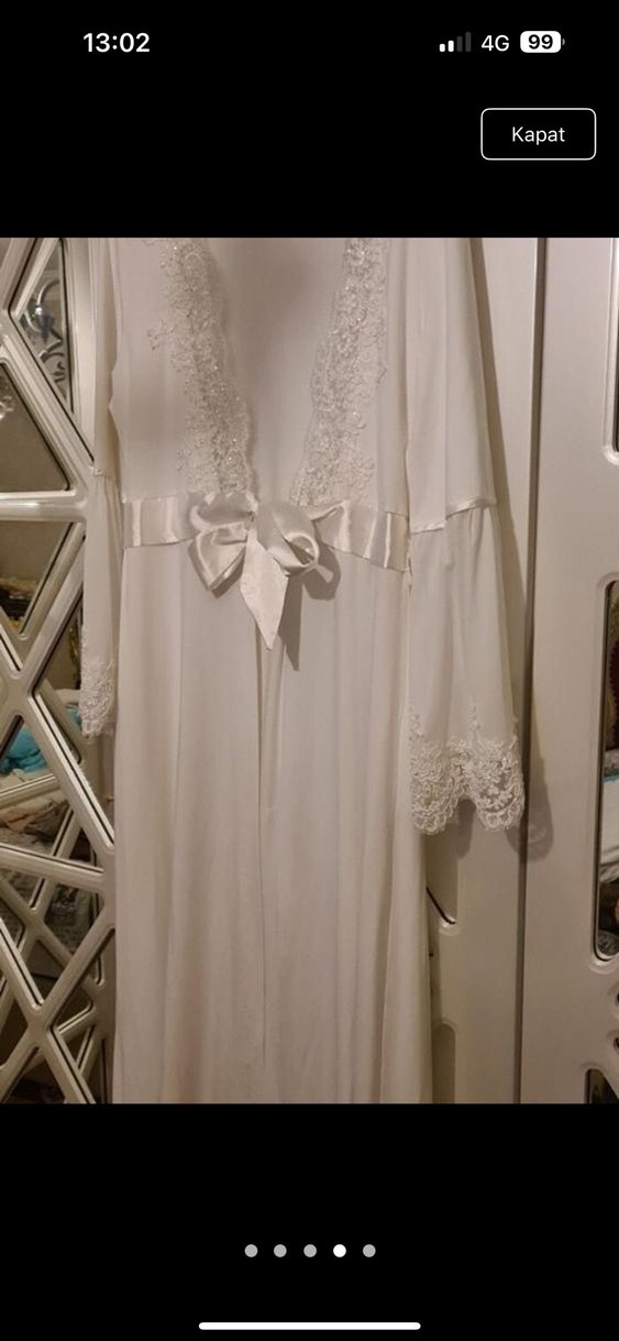 Gevşek kesim, uzun beyaz sabahlık, zarif nakış detayları ve askılı kollarla Paris tarzı bohem şıklığı sunar, saten fiyonkla tamamlanmıştır.