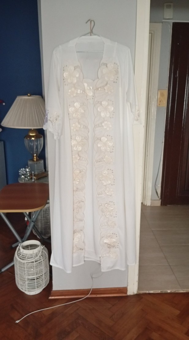 Uzun Beyaz Nakışlı Bohem gecelik sabahlık takım