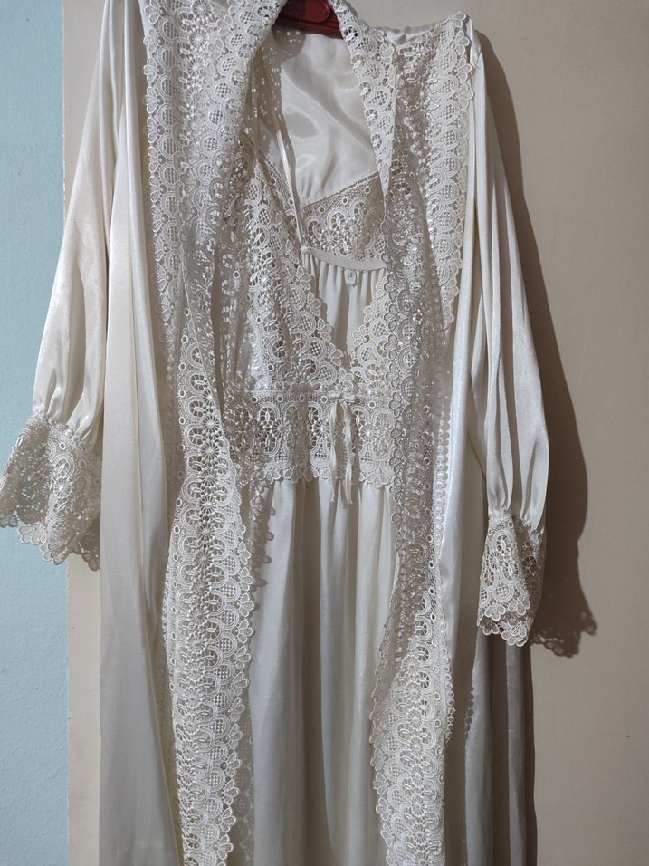 Uzun beyaz nakış detaylı, bol kesim bohem tarzda sabahlık ve gecelik. İp askılı kollara sahip, hafif ve rahat kumaştan yapılmıştır. Çeyiz ürünüdür. Hiç kullanılmadı, sıfır üründür. Görselde ölçüler mevcuttur. 38-40 bedendir.