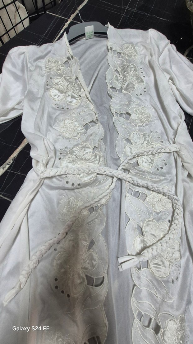 Uzun beyaz kadın sabahlık, nakışlı çiçek desenleri ve ince askılı kollara sahiptir. Bol kesimi ve örgülü kemeri ile rahat bir kullanım sunar. marka temsili