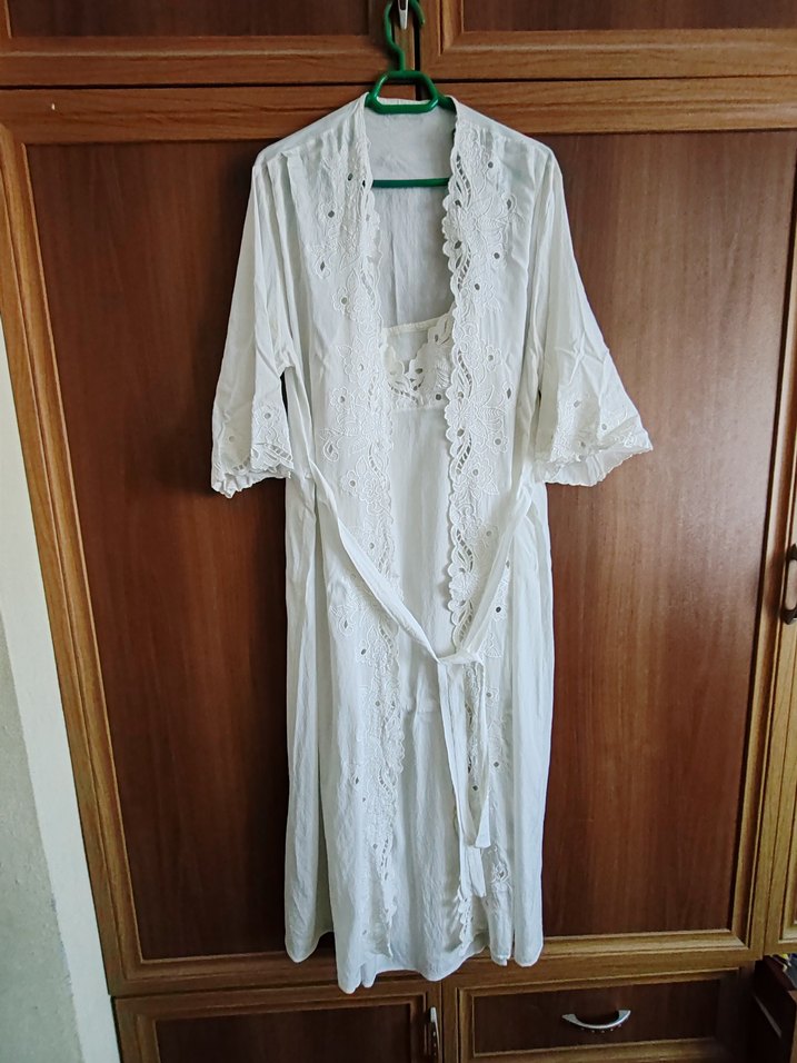 Uzun beyaz bohem tarzı elbise, ince işleme detayları ve salaş kesimi ile dikkat çeker. Kolsuz tasarıma sahip, hafif ve rahat bir kumaştan yapılmıştır.