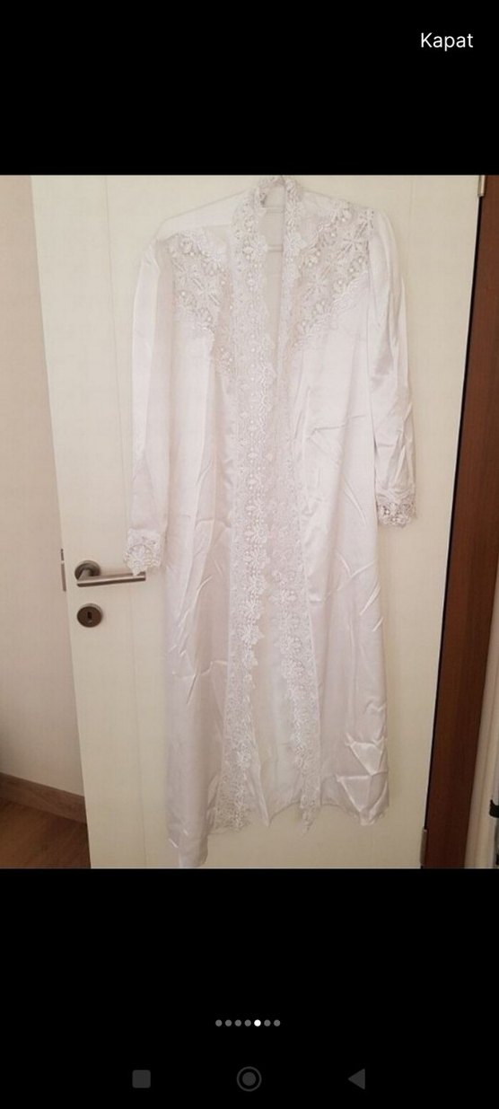 Uzun, beyaz, nakışlı detaylara sahip kadın sabahlığıdır. Bol kesim ve uzun kolludur, vintage tarzını yansıtır. Hafif ve zarif bir görünüme sahiptir. 36 38 bedene uygun hiç kullanılmamıştır