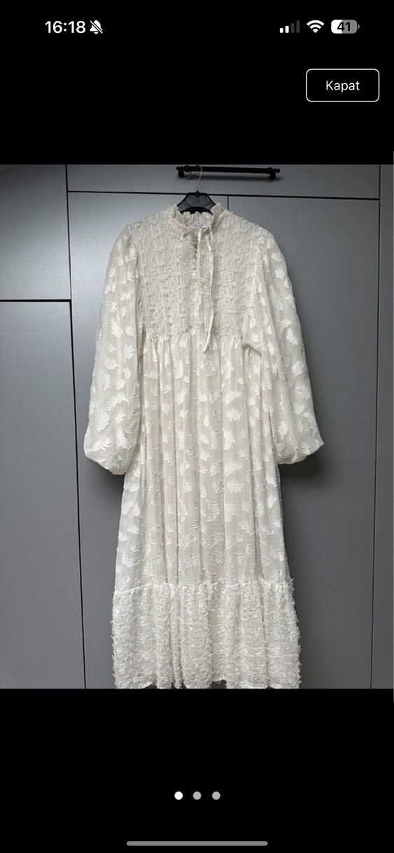 Uzun beyaz keten elbise, nakışlı desenler ve fırfırlı etek ucu ile. Uzun kollu, bağcıklı yüksek yakalı ve bol kesimdir, bohem tarzına uygundur. #tesettür elbise