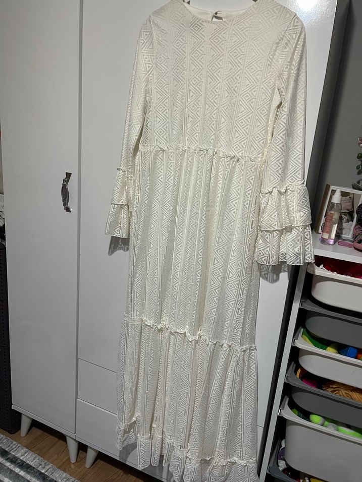 Uzun beyaz pamuklu elbise, nakışlı desenlere ve volanlı uzun kollara sahiptir. Salaş kesim ve yuvarlak yaka ile bohem tarzını yansıtır.