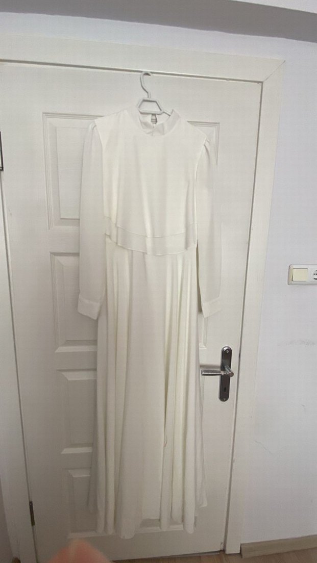 Uzun beyaz elbise, uzun kollu ve yüksek yakalıdır. Sentetik kumaştan, drapeli ve sade tasarımlı, klasik modern stilde, düğün için uygundur.