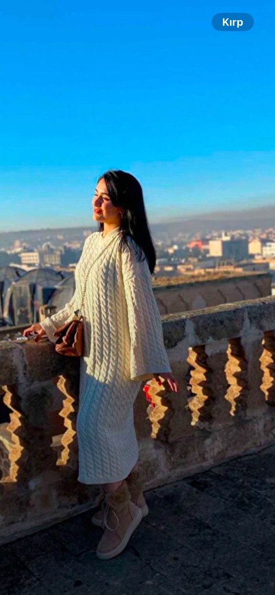 Uzun, beyaz renkli, etnik desenli, bol kesim, uzun kollu ve yüksek yakalı örgü triko elbisedir.