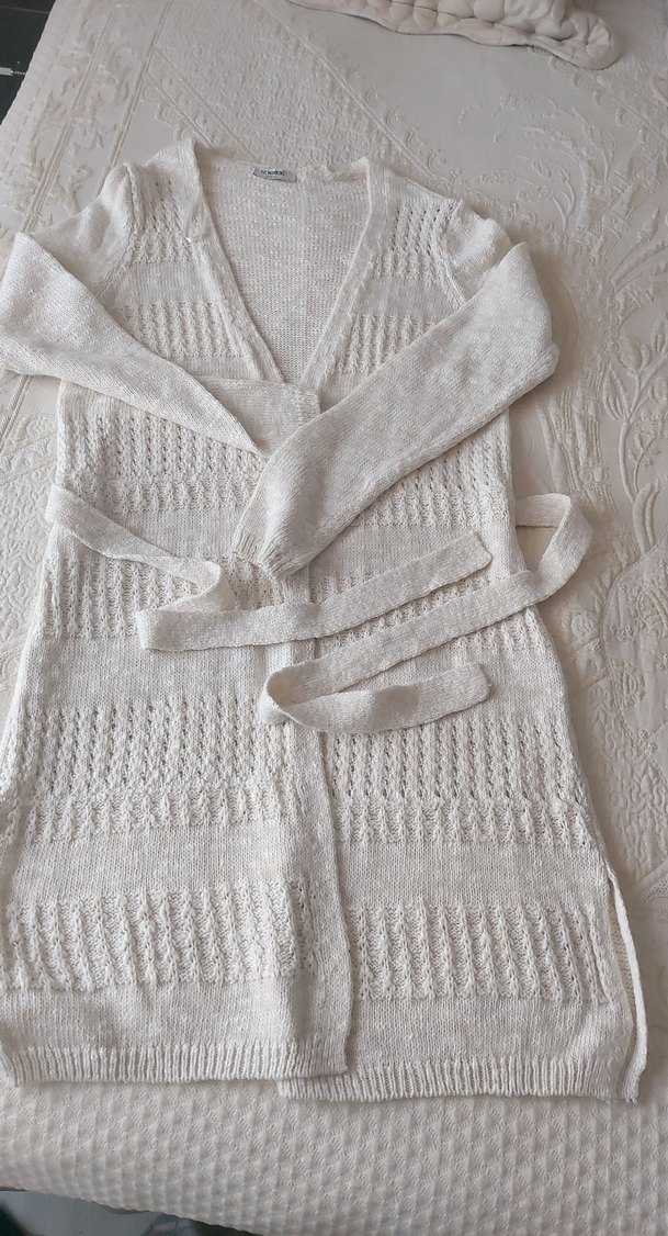 Uzun beyaz örgü kadın hırka, V yakalı ve bol kesimdir. Yumuşak örgü kumaştan yapılmış, askılı kollu ve rahat bohem tarzındadır.