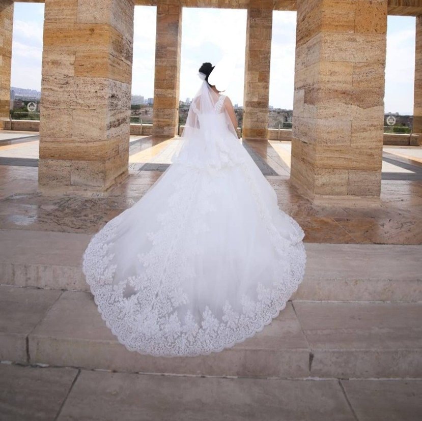 Beyaz prenses gelinlik, straplez ve ince askılı, vücuda oturan kesim ve uzun, uçuşan etek uçlarında detaylı dantel işlemeye sahiptir. ✨ sadece 4 saat giyildi ankarada yasiyorum isteyen gelip deneyebilir özel dikimdir