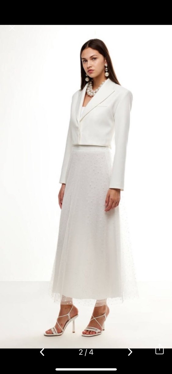 Uzun kollu, beyaz renkte etek, iç astarı var ama yetersizdir. Hiç giyilmedi . Etiketli