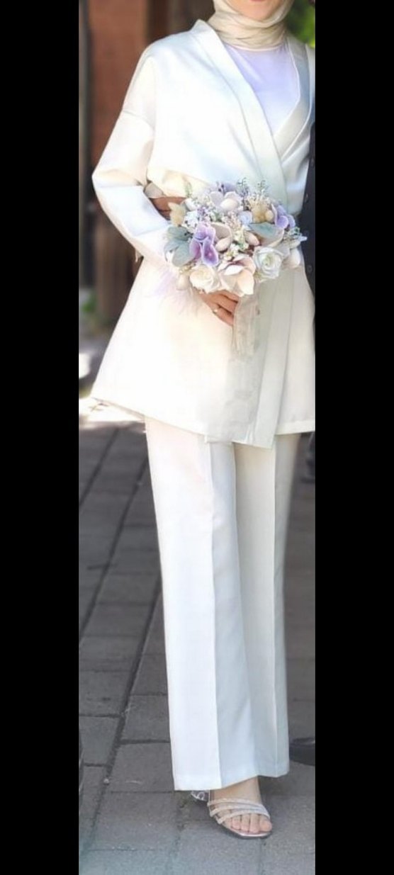 Uzun, beyaz renkte, kolları tüylü taşlı kemerli özel günlerde gidilebilecek ceketli tunik . 1 kere nikahımda giydim onun dışında giyilmedi. (Pantolon hariç)