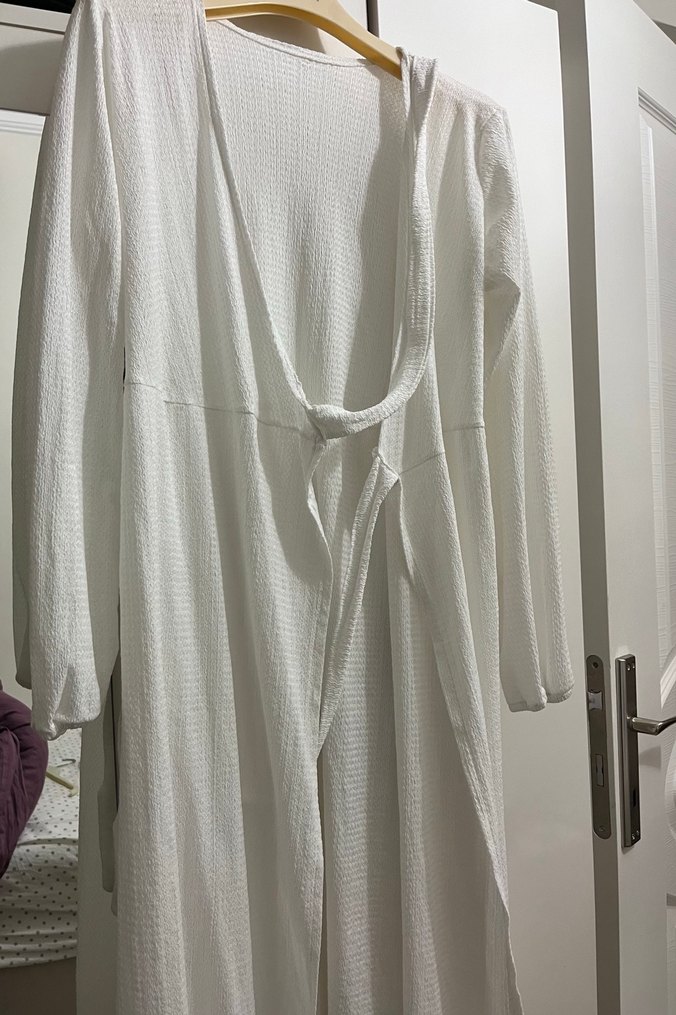 Uzun, beyaz, salaş kesim kadın sabahlık. İnce askılı ve desensiz, minimalist bohem tarzda.