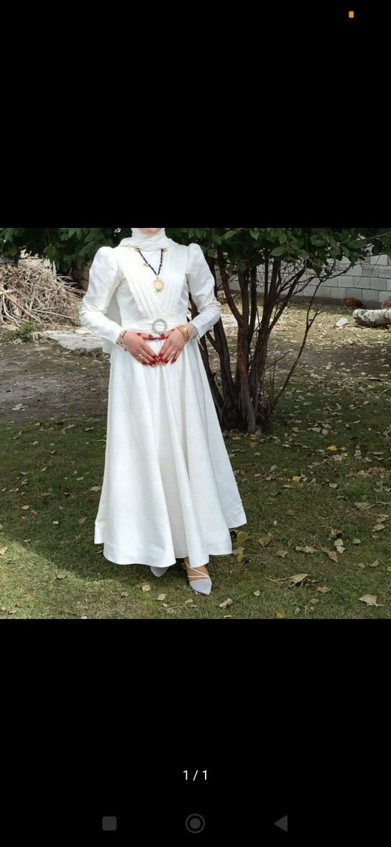 Yüksek yakalı, uzun kollu ve saten dokulu bu uzun beyaz elbise, nikâhta bir kez giyilmiş tertemiz ürün