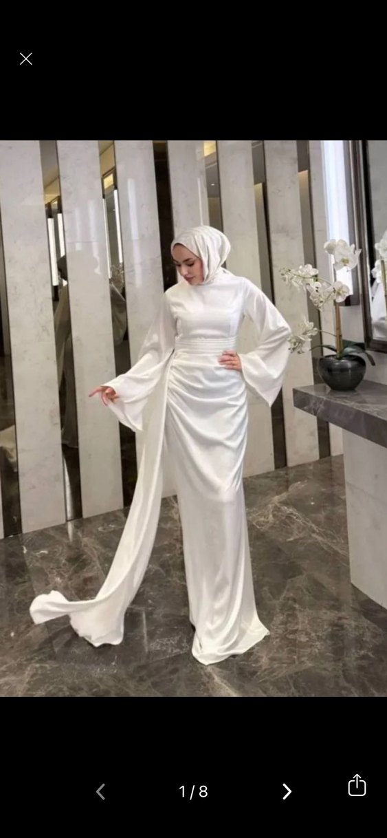 Uzun, beyaz renkte, saten dokulu kumaştan yapılmış, yüksek yakalı ve uzun kollu drapeli tesettür abiye elbise. Düğünler için uygun, sade ve şık tasarım.