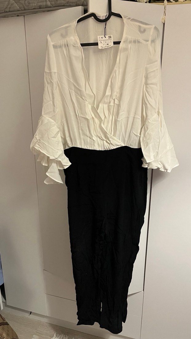 Uzun, v yaka ve uzun kollu tulum beyaz fırfırlı kollara sahip yeni etiketli. İndirim almıştım paçalarında sökükler var alırken görmemişim :)