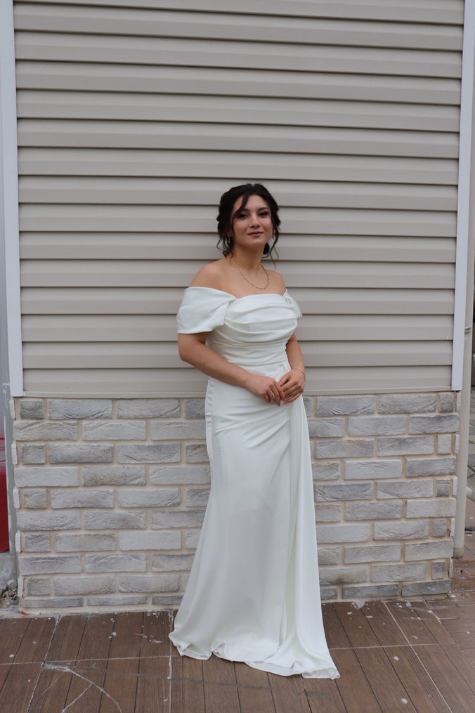 Uzun beyaz düğün elbisesi, straplez yaka ve askılı kollarıyla modern klasik bir tarz sunar. Minimalist ve klasik şıklık için uygun. Göğüs drapesinin altında taşlar var nişan nikah için uygun yırtmacı mevcut fakat kapanıyor