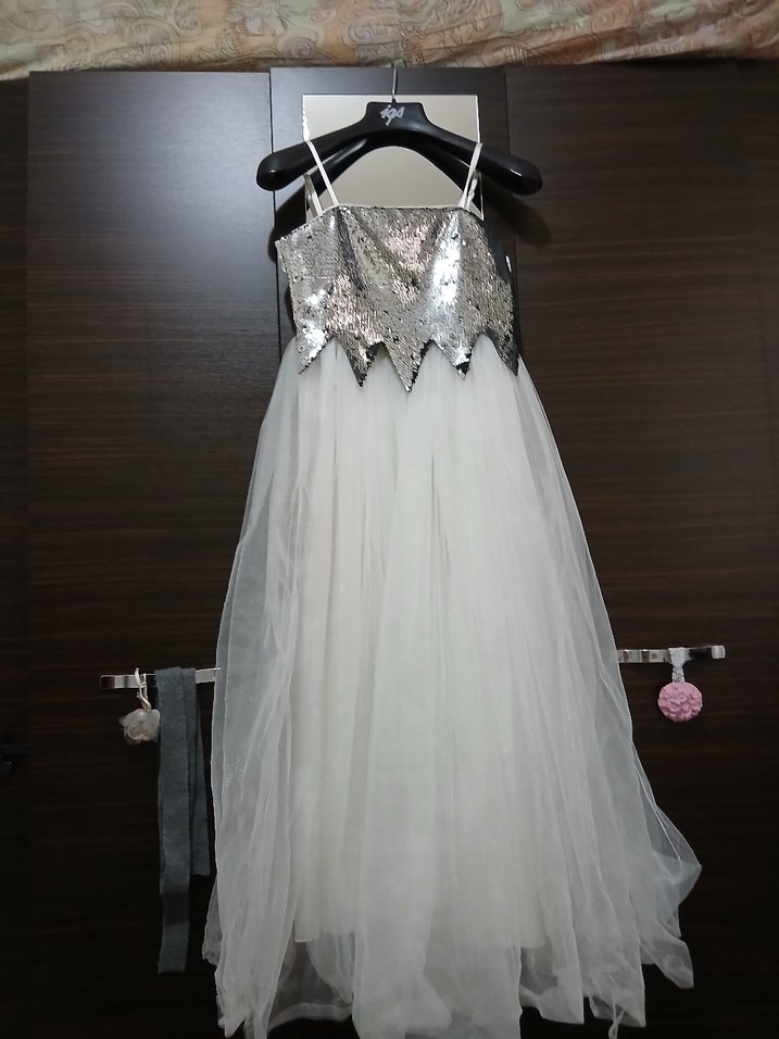 Uzun, straplez, drapeli üst kısmı baskılı metalik desenli, beyaz uçuşan etekli fitted abiye elbise, avant-garde tarzı sevenler için uygun. 116 santim uzunluk