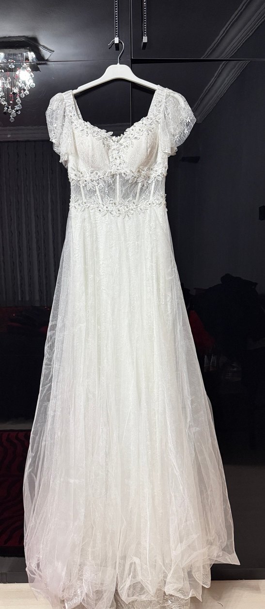 Uzun, vücuda oturan taş ve dantel detaylı beyaz abiye elbise. Hiç kullanılmadı. Nişan ve söz elbisesi.
