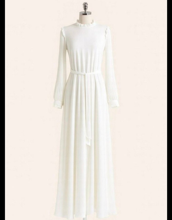 Yüksek yakalı, uzun kollu, çiçek desenli ve drapeli beyaz, sentetik kumaştan yapılmış, sade ve tesettür uyumlu uzun elbise.