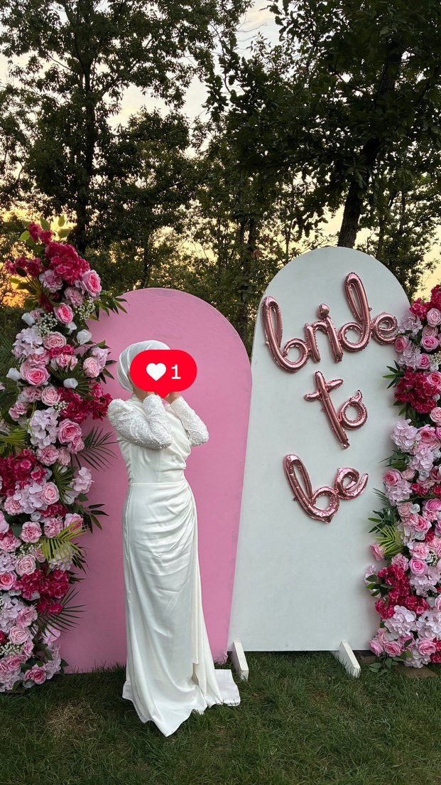 Yüksek yakalı ve uzun kollu, drapeli ve hafif desenli beyaz uzun elbise. Tesettürlü ve minimalist düğünler için uygun.