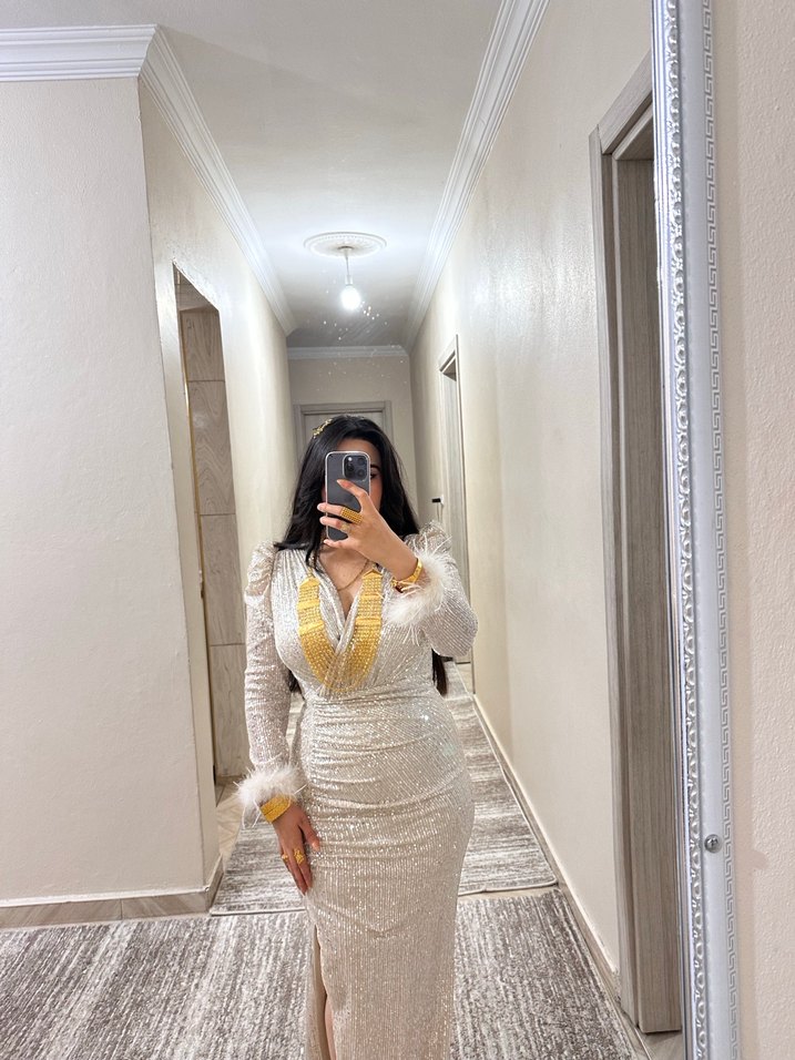 Bu uzun, beyaz, vücuda oturan abiye elbise V yakalı ve uzun kollu, transparan nakış detaylarıyla gösterişli bir parti şıklığı sunar. ✨