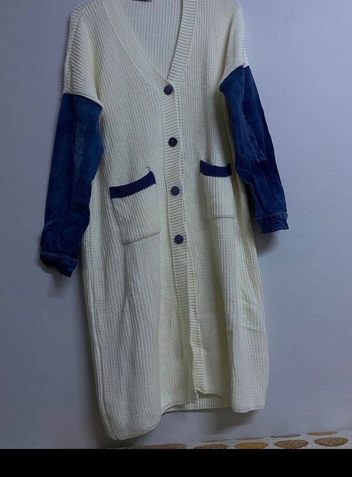 Uzun Beyaz Triko Hırka Kot Kollu