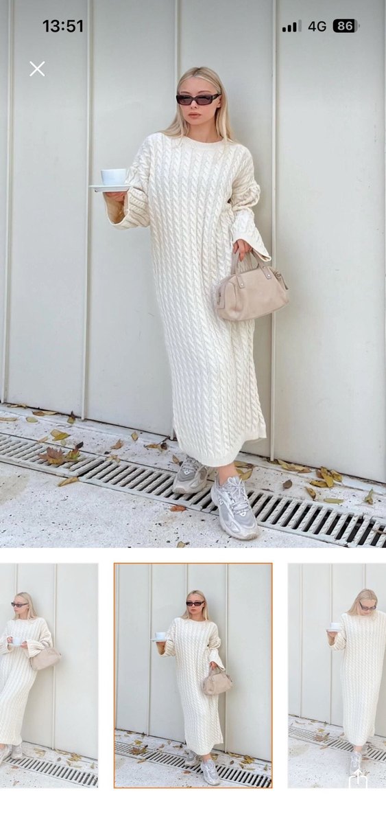 Bu uzun beyaz triko elbise, salaş kesimi ve yuvarlak yaka detayıyla dikkat çekiyor. Rahat ve örgü dokusuyla günlük sokak stiline uygundur.