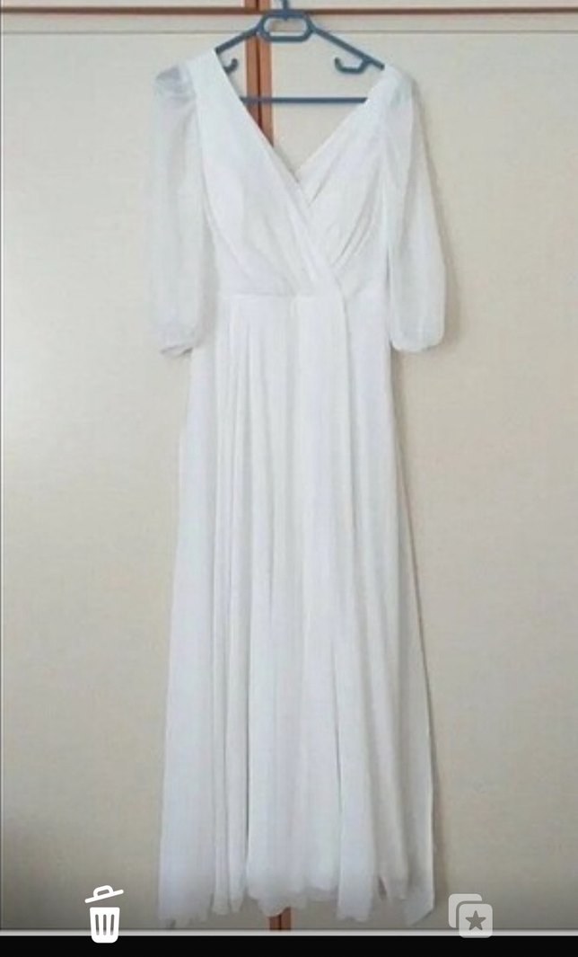 Uzun beyaz elbise, V yakalı ve uzun kollu, bol kesimli, modern klasik stilde düğünler için uygun minimal şıklık sunar.