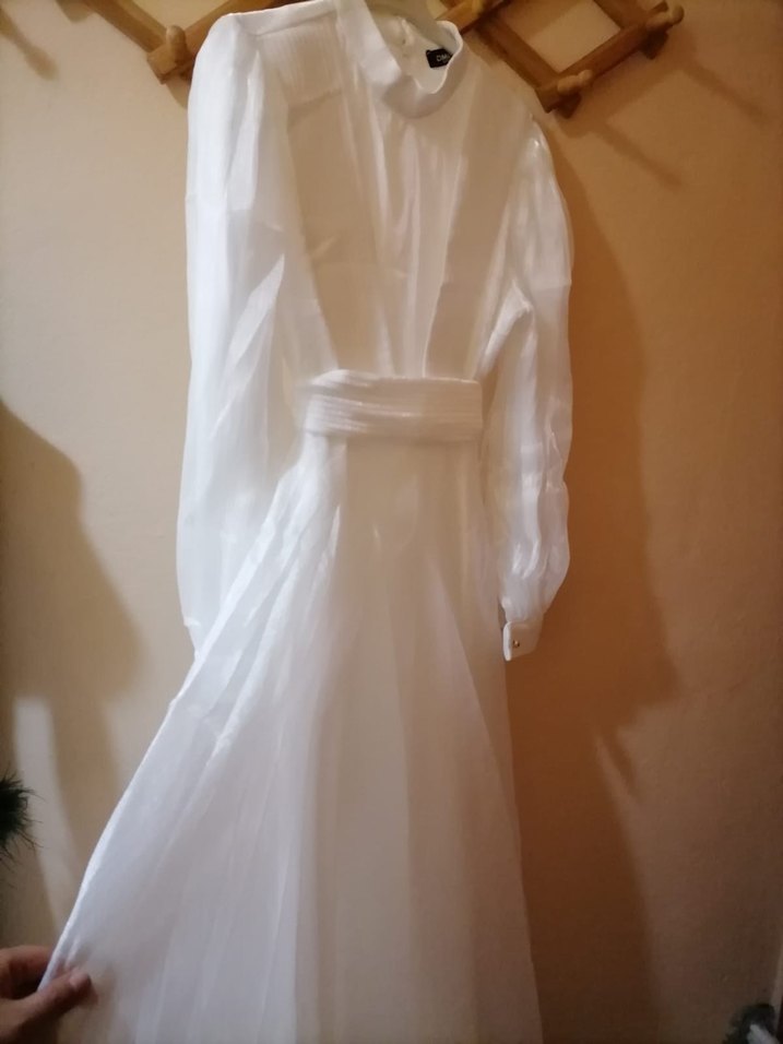 Yüksek yakalı, uzun kollu ve beli oturan, A kesim etekli beyaz vintage tarzı gelinlik. Klasik ve geleneksel tasarımıyla zamansız bir şıklık sunar.