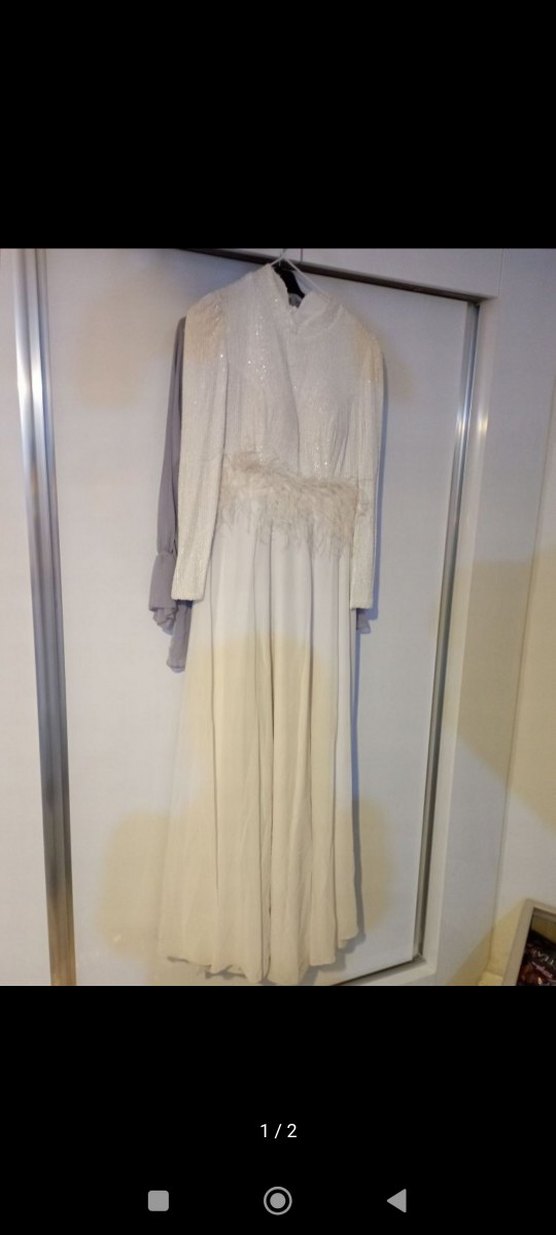 Uzun beyaz elbise, dökümlü tasarımı, bol kesimi, uzun kollu ve V yaka detaylarıyla vintage ve bohem tarzını yansıtıyor. Düğün için uygun.