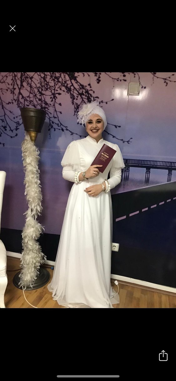 Uzun beyaz tesettür elbise, yüksek yakalı ve uzun kollu, drape detaylıdır. Etnik desenli, regular fit ve vintage tarzda bir modeldir.