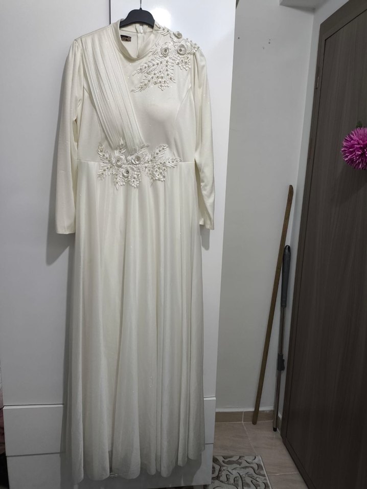 Yüksek yakalı, uzun kollu ve bol kesimli uzun beyaz elbise. Drapeli detayları ve çiçek süslemeleriyle vintage ve klasik şıklık sunar.